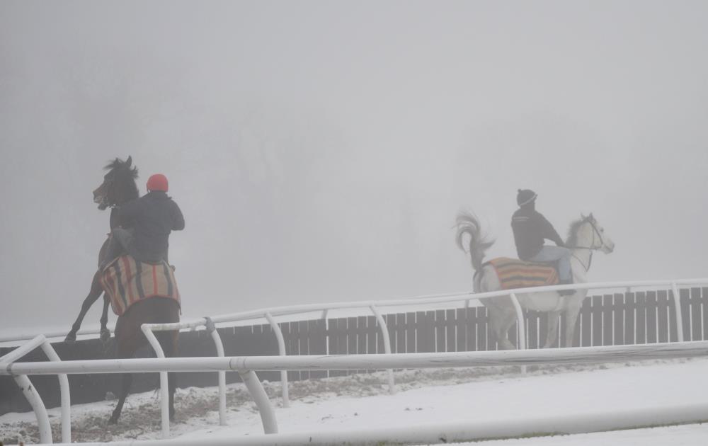 By now, I needed to warn George and the lads of what lay ahead so, racing down the grass gallop as fast as the little green “John Deere Bentley” could manage I tried to reach them before they had started on their trek up the ‘not so all weather- all weather’ when I was confronted by them appearing like ghosts out of the mist and heavy snowfall. Quickly jumping out of the Bentley waving arms and yelling “DEEP SNOW”” DEEP SNOW”over and over only for George to canter past with a grin like a Cheshire cat shouting, “Snows fine, Snows fine……..”