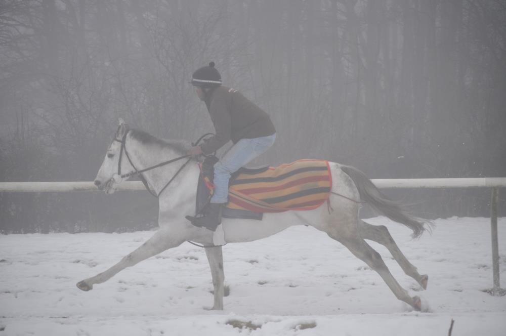 Sunday threw even more snow at us and his mornings thaw was barely noticeable although by this afternoon we could see green paddocks under water and our plumbers spent all day fixing burst pipes. Poor Gorse had to move house as his box was under water this morning, and he almost needed armbands but we did manage to get two lots out this morning including tomorrow’s runner whose race looks ideal but she has missed some work.