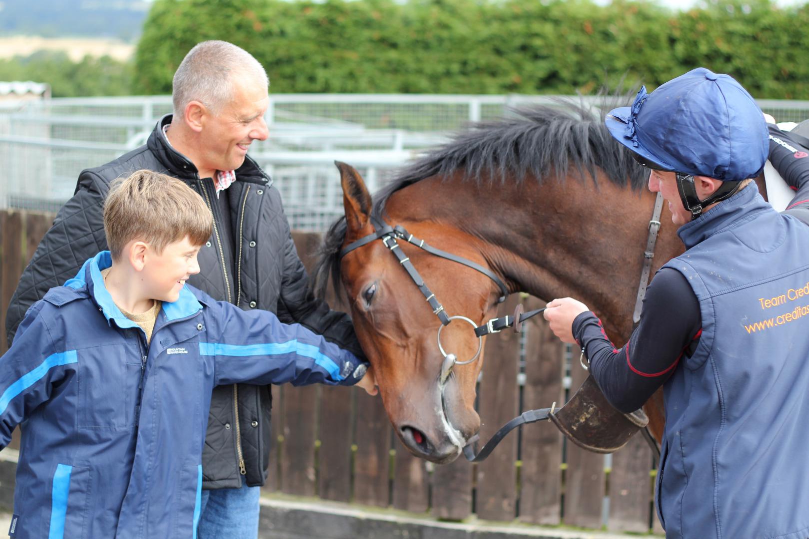 It's always great to see our owners and today we welcomed Mark and his son Robbie, who made the drive down from Ayrshire to see their syndicate filly, 'Clifftop Dancer'. Clifftop was cantering once up the all-weather this morning under Shane Gray before relishing the attention her visitors bestowed on her. She's a sweetheart who loves being fussed and cuddled. Mark works as a mounted police officer and it was fascinating to hear about the training and requirements of a police horse. Mark rides an 18 hh clydesdale called 'Franco' because he is infact the Frankel of clydesdale racing, an unbeaten 'race' horse who has been ridden by professional jockeys on the track! All in the name of good fun of course! Hopefully we can be as lucky with Clifftop Dancer, I don't think life as a police horse would quite suite her...