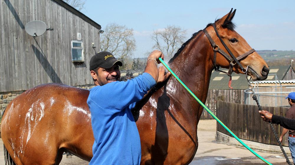 The horses looked great today with the sun on their backs, some of them had gone backwards slightly in their skins with the recent cold spells, this time of year always plays havoc with horses and particularly our boys and girls (even more so for the girls) because the yard is exposed, this does have considerable benefits too which are, in the long run to our advantage. Sun Hill is 200 feet higher than Middleham and our old vet Simon Stirk used to arrive here after his visits in the old market town telling me we were "a top coat colder". Today however the horses enjoyed the sun and a couple of dozen of them had a shampoo and set outside. George and I went to Doncaster breeze ups for a few hours and were sorry we had not set our stall out to buy lots of two year olds because it was a middle market buyers paradise, otherwise known as a "bloodbath" for vendors.