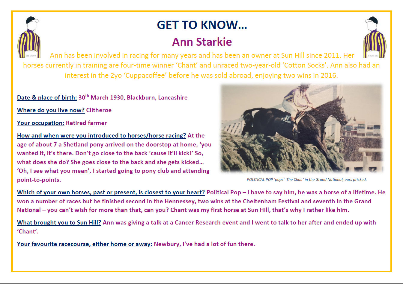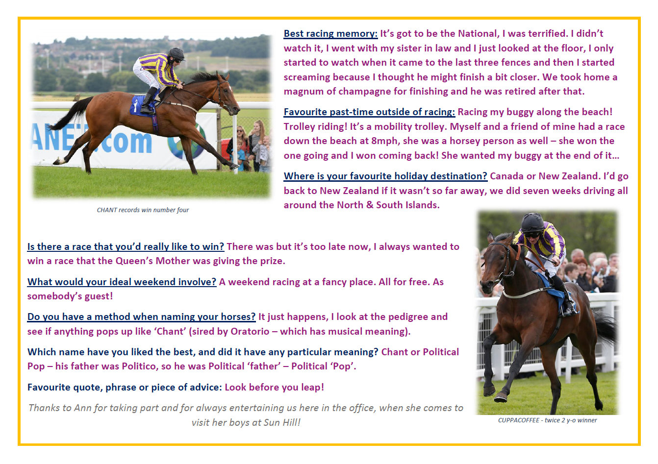 Four runners today. This season winner Arnold heads up to Hamilton while Peach Pavlova, Port Master and Chant go to Ripon this eveving. Earlier in the week, I (Hayley) sat down to chat with owner of Chant and teller of brilliant stories, Ann Starkie. Below is the result. Hope you enjoy.