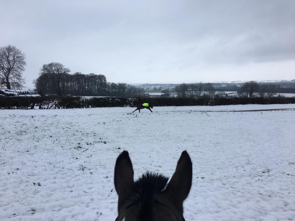 With the first official day of Spring arriving not long ago, it came as quite a shock to see the yard under snow this morning. Waterproofs and thick exercise sheets were back out in force against the bitter cold and the horses certainly felt fresh, enjoying themselves in the unseasonal heavy snowfall. The all-weather gallop was fit for steady work so all of the horses went about their daily exercise albeit a shortened version, despite the unwelcome presence of the white stuff!
